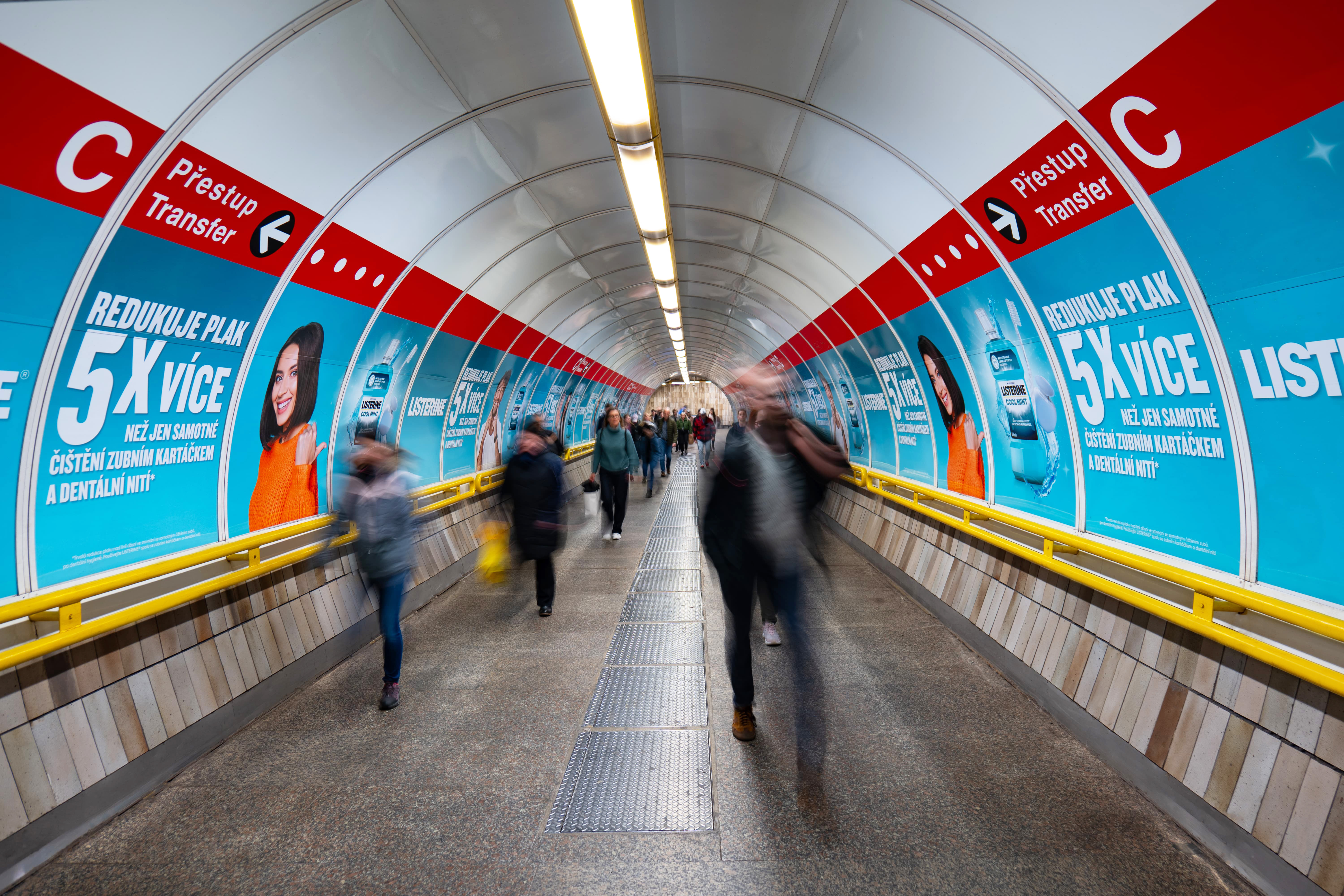 Polep stěn přestupních tunelů nejvytíženějších stanic metra Můstek, Muzeum, Florenc. Obrovský prostor pro masivní komunikaci více produktů, nových kolekcí apod.